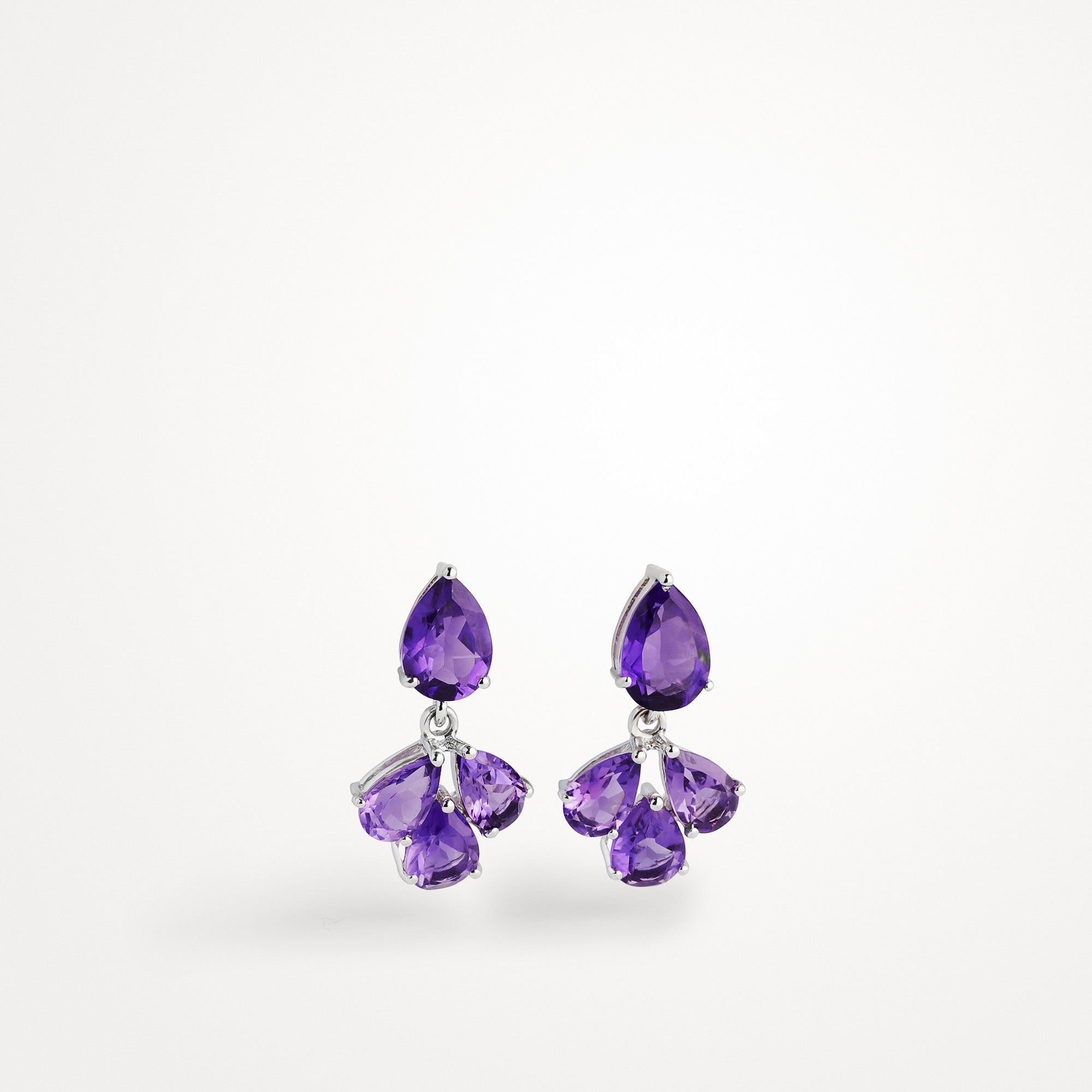 These lovely amethyst earrings are the perfect way to add a touch of elegance to any outfit. Crafted from the finest quality materials, these exquisite earrings feature a collection of different sizes of pear-cut stones. The iridescent purple hue of the amethysts is said to be spiritually uplifting, making these earrings the perfect choice for any occasion.