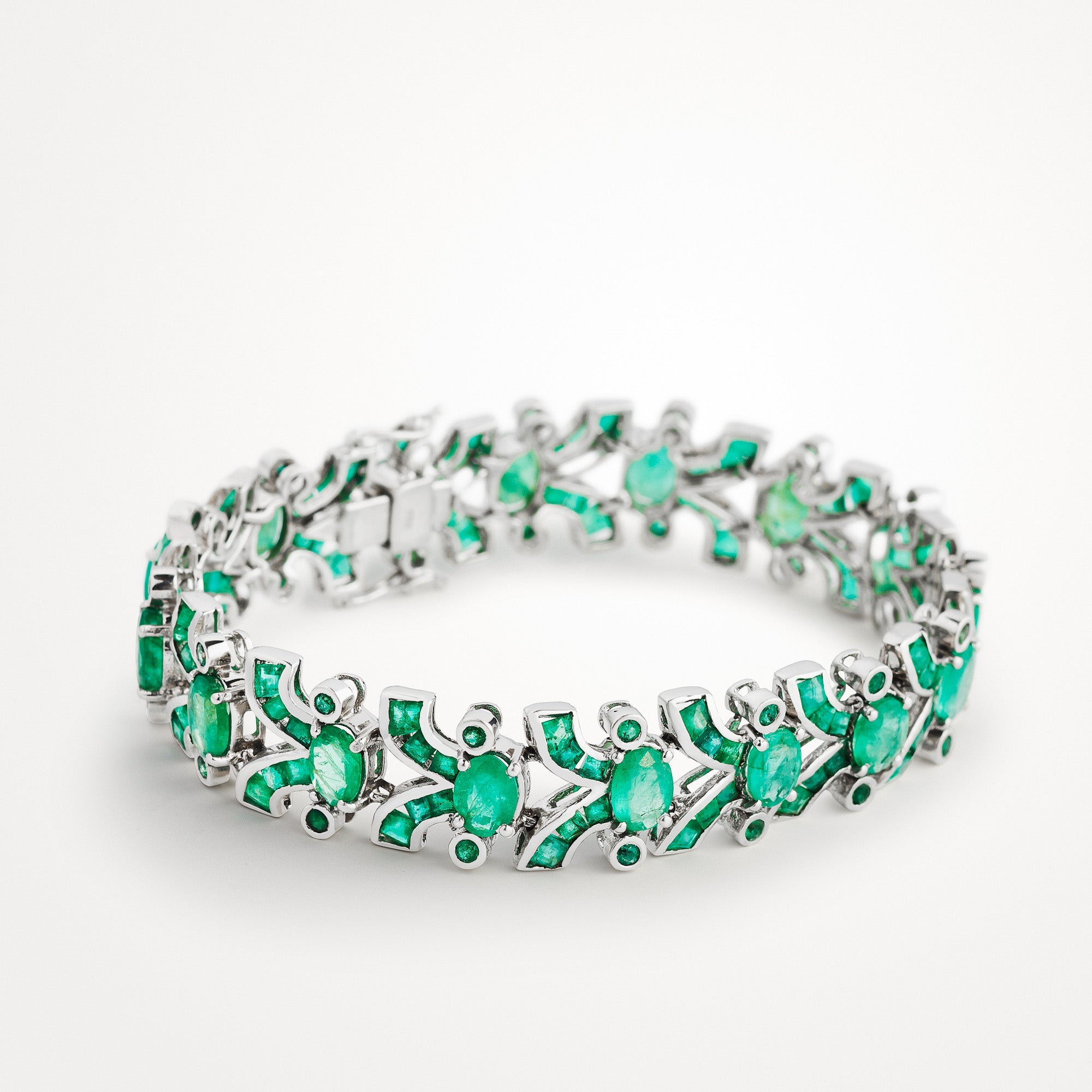 Introducing the Emerald Bracelet Growth, a luxurious and statement piece that is perfect for any elegant outfit. This bracelet features square and round emeralds arranged in a beautiful pattern. The fresh green color of the emeralds is said to represent growth, fertility and wisdom, making this bracelet the perfect accessory for a woman who wants to infuse life with curiosity and joy. You can wear this bracelet at any festive occasion and when you need a reminder to take on new challenges with a growth mindset.