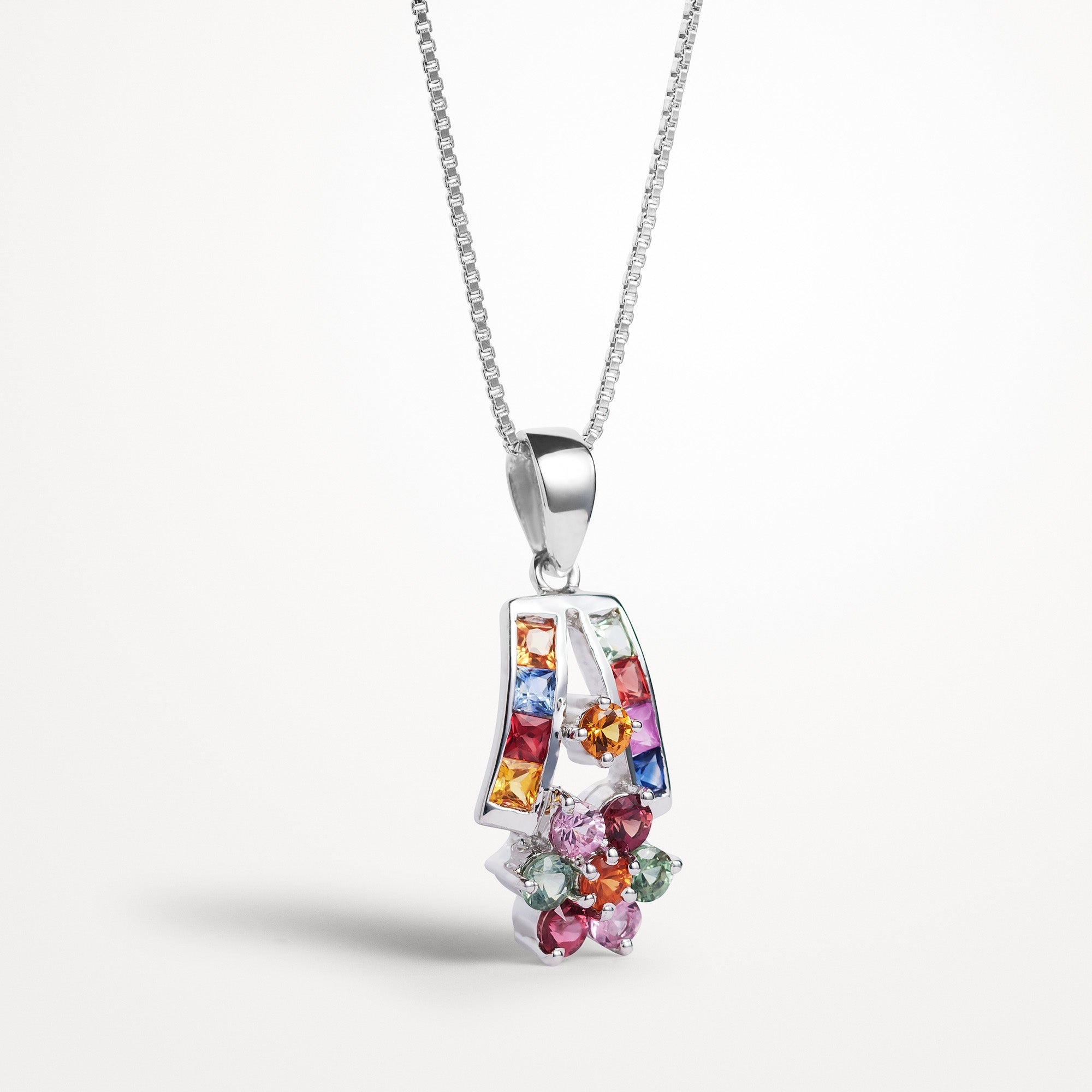 Add some creativity and personality to your outfit with this multi sapphire pendant. The colourful sapphires come together to form a beautiful floral design, making it the perfect accessory for any outfit. And because each stone is hand-selected, you can be sure that your pendant is one of a kind. The pendant is perfect for adding a splash of colour to any outfit. Whether you're dressing up for a special occasion or just looking to add some pizzazz to your everyday look, you will never go wrong with this necklace. So, let your personality shine through with this unique and beautiful pendant.