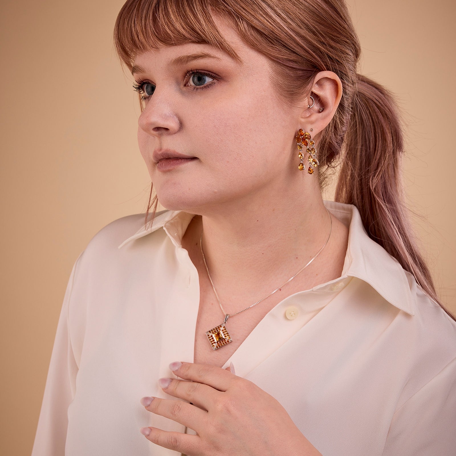 The Citrine pendant Wealth is a beautiful piece of jewellery that combines the classic look of round-cut citrines fitted on modern-day style of rhombus-shaped pendant. This beautiful pendant is perfect for those who appreciate the finer things in life and are looking to add a touch of luxury to their wardrobe. The citrine is also a semi-precious stone that is known for its tranquillity and spiritual properties. It is said to bring wealth and success to its owner. This makes it the perfect gift for someone special in your life who could use a little good luck.